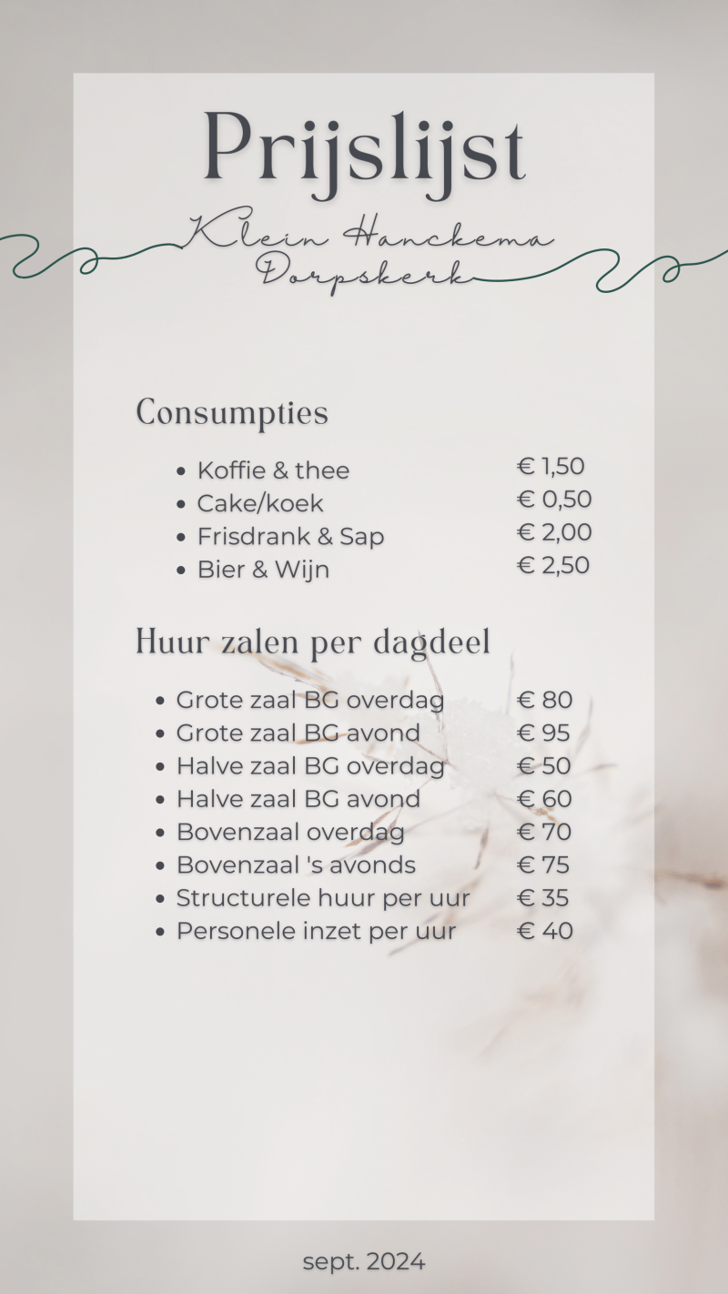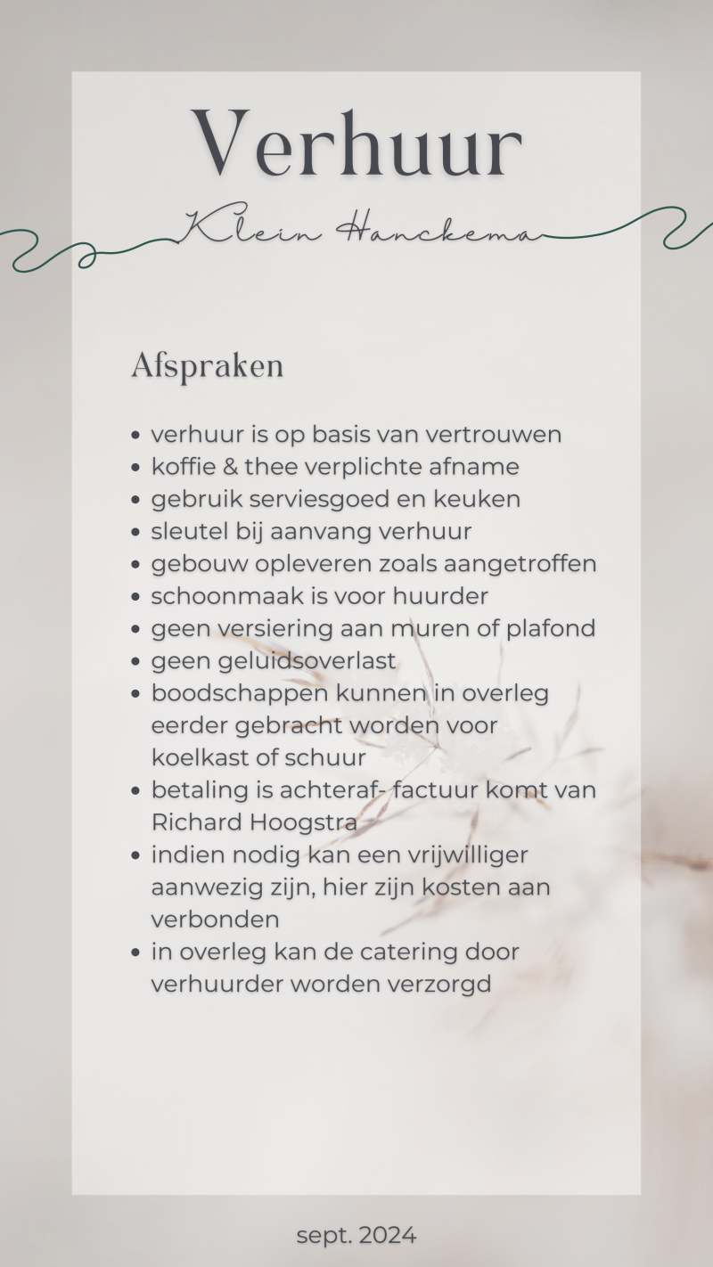 Heeft u belangstelling om de kerk of Klein Hanckema te huren? Neemt u dan gerust vrijblijvend contact op met de koster, mw. Sabrina van den Berg-Dreckmeier 06-42554544, kosterdorpskerkzuidhorn@gmail.com